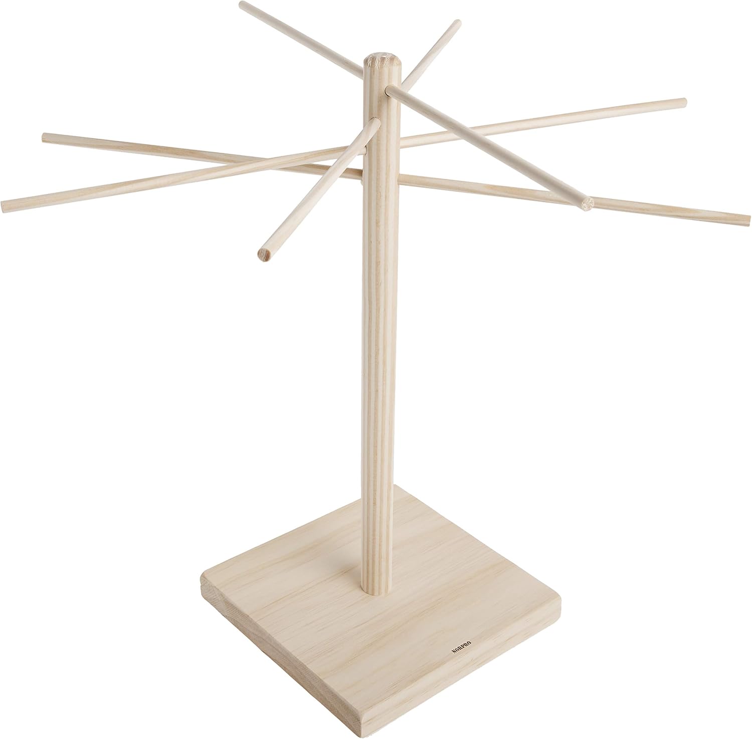 Norpro's traditional wooden drying rack is ideal for drying fresh homemade pasta. Includes eight sturdy arms angled so pasta won't overlap. Unfinished wood prevents pasta strands from sliding off the rack while drying, keeping your pasta fresh and clean. Thick, heavy base provides stability. Easy to assemble and disassemble, allowing for convenient storage. Drying rack measures 16.5 inches tall and dowels measure 18 inches across. Hand washing recommended.